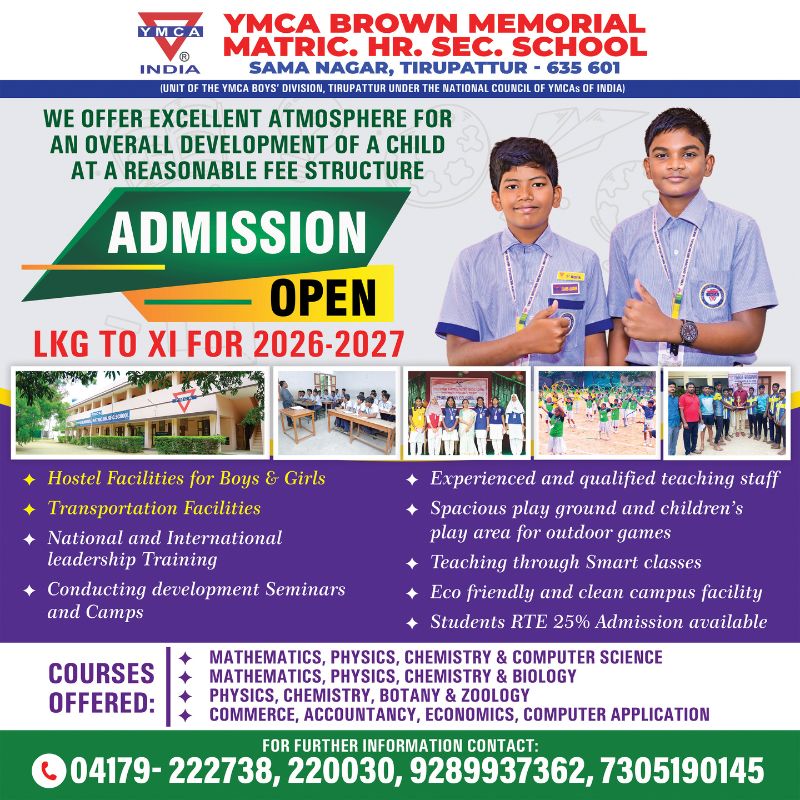 YMCA Brown Memorial Matriculation Higher Secondary School is a Christian co-educational unaided minority school, established and administered by the Committee of Management of YMCA Boys’ Division. (A Project of the National Council of YMCAs of India). It is situated near the Tirupattur Railway Station in a spacious campus with modern facilities.